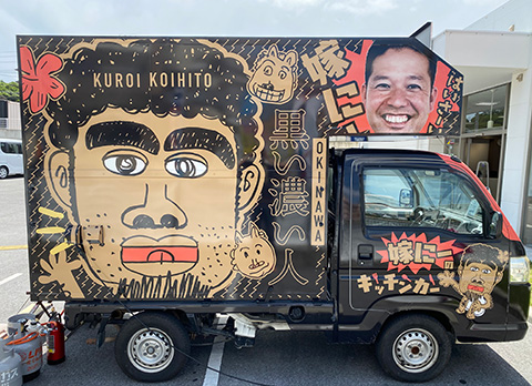 マツコさんと村上さんの「月曜から夜更かし」で話題となった嫁ニーの黒い濃い人キッチンカーです。どこを走っていても目に留まる派手なカラーリング。オリジナルの黒いサーターアンダーギーや黒い餃子をはじめ沖縄発祥のタコライスなど、沖縄が満喫できるキッチンカーです。